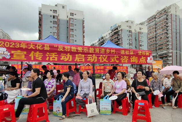 广西反邪教网6月30日大化讯(通讯员 苏湘红)为进一步夯实反邪教工作基层基础,不断增强广大人民群众尤其是乡村居民和校园师生群体对邪教的辨识能力,切实筑牢防邪、反邪的思想“防火墙”,今年以来,广西壮族自治区大化瑶族自治县整合各方面力量,先后在大化镇古江社区、雅龙乡镇西村、大化镇民族新城小学和16个乡镇政府所在地等辖区开展各种形式多样的“反邪教警示教育进进乡村进校园”系列宣传活动,收到良好的宣传效果。