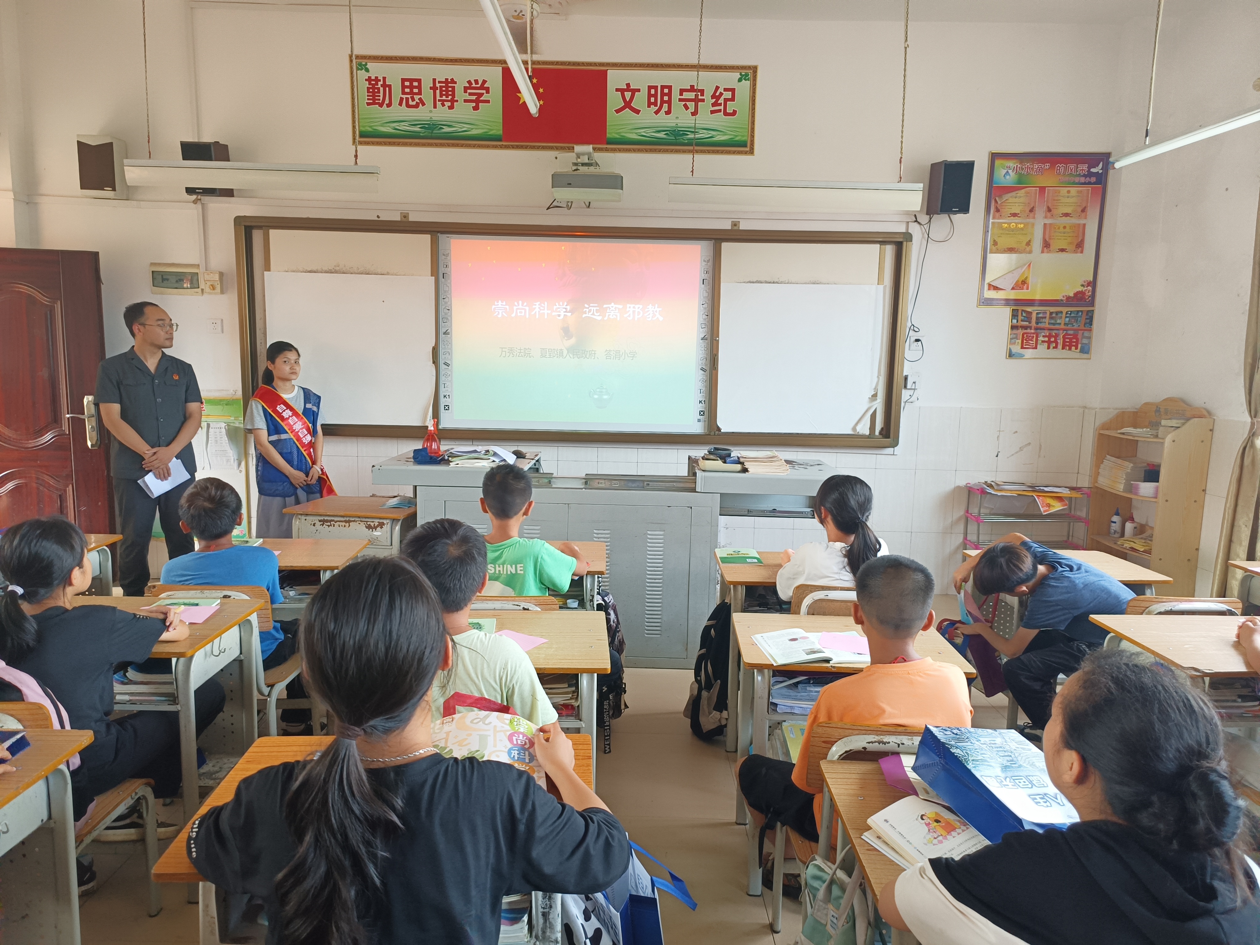 活动中,万秀法院干警向学生们详细讲解什么是邪教、毒品等内容,引导学生们共同学习毒品的种类与危害,让学生们对“毒品给个人、家庭、社会带来的严重危害”更深入头脑。随后,夏郢镇反邪教志愿者给同学们播放了“防邪反邪”视频,利用PPT向学生们普及什么是宗教、什么是邪教、邪教与宗教的区别、邪教的危害以及国家依法打击整治邪教和非法传教活动取得的成果等内容,提醒学生们保持警惕,不要被网络上、生活中遇到的邪教组织活动迷惑,遇到邪教活动要坚决说不,并告诉家长、老师,积极向公安机关举报。