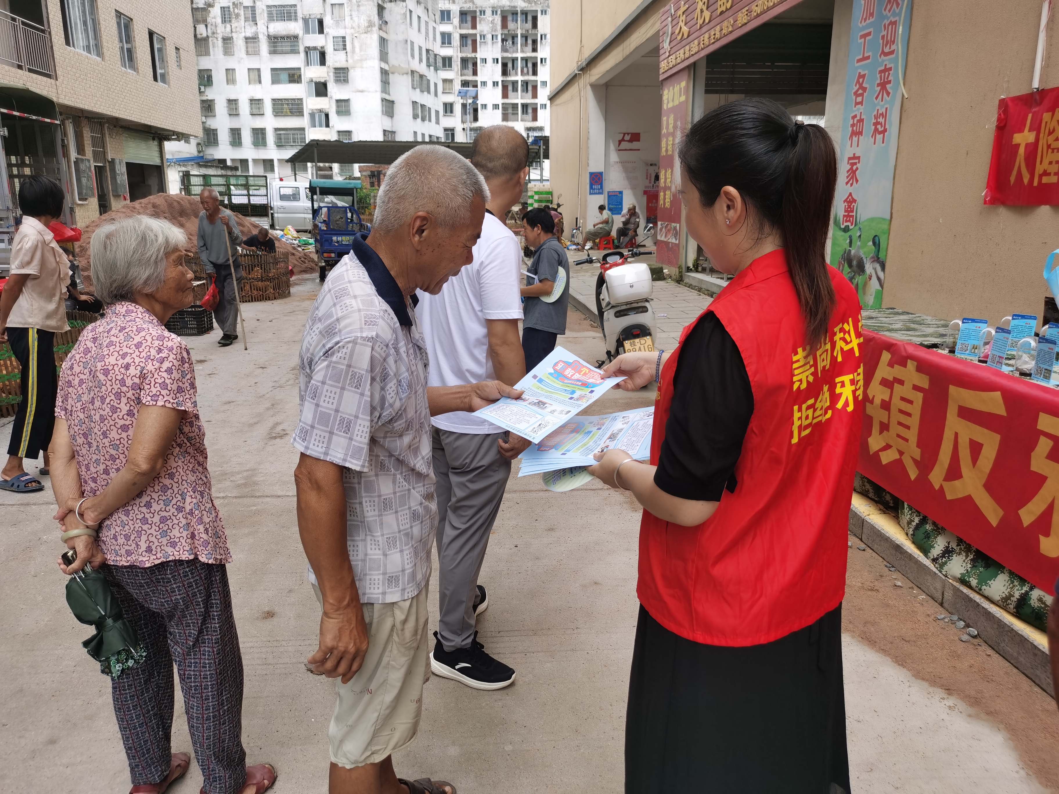 在街巷中,工作人员身穿红马甲,热情地向来往群众发放宣传单,并积极引导群众来到宣传点参观摆放的各类毒品模型,教育群众做到自身不好奇、不尝试、不贩卖毒品。