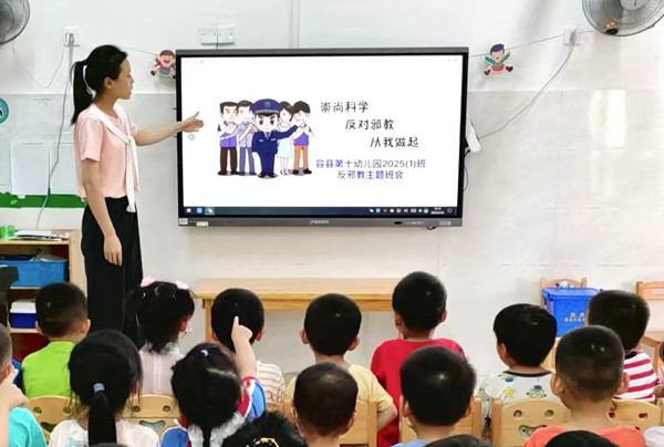 图为在容县第十幼儿园开展的反邪教主题课堂