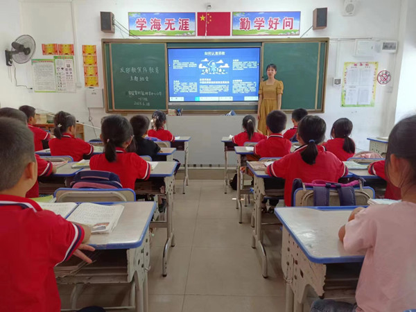 图为容县黎村镇珊萃中心小学开展的反邪教主题班会