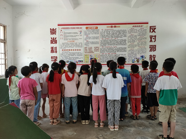 图为在容县县底镇泗关小学的孩子们在参观反邪教主题墙报
