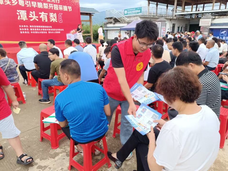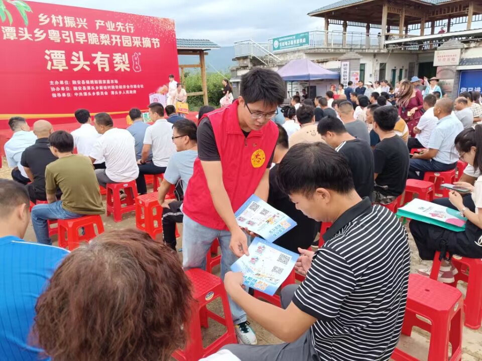 广西反邪教网柳州8月8日讯(通讯员 余当 谢覃宁)“玉乳秋梨应已熟,君归多摘带清霜”,虽立秋未至,但成熟期为6月下旬至7月上旬的广西融安县潭头乡种植的粤引早脆梨已挂满枝头。7月18日,广西柳州市融安县在潭头乡举办“潭头有梨”粤引早脆梨开园采摘节活动,反邪教志愿者深入活动现场,开展反邪教宣传教育活动。