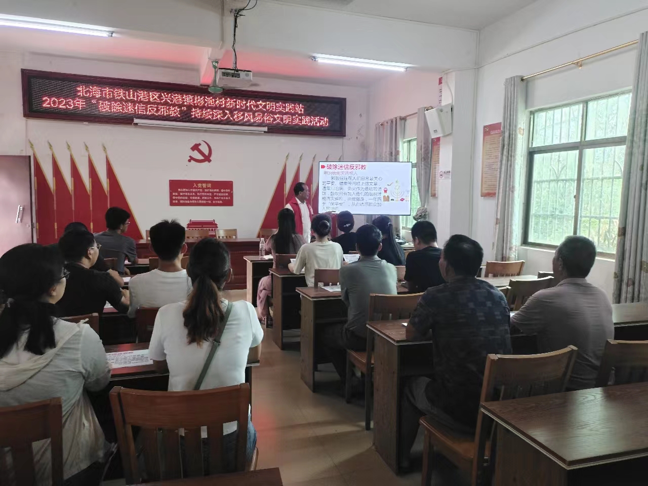 广西反邪教网北海8月9日讯(通讯员 莫艳艳)“八一”建军节当日,广西北海铁山港区委政法委到彬池村委开展反邪教宣讲活动,进一步提高群众反邪意识。