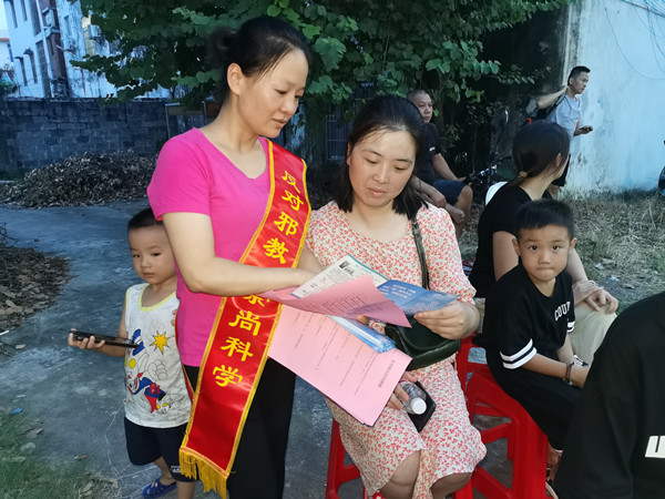 图为在成均镇比赛现场反邪教志愿者向群众讲解反邪教知识