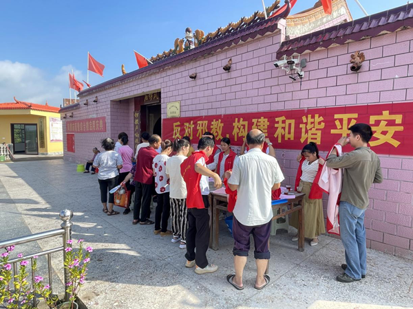 为进一步提高信众群众识邪、防邪、拒邪的意识和能力,促进宗教发挥好在反邪教斗争中的积极作用,确保宗教场所安定有序,夯实反邪教基层根基,8月16日(农历七月初一),兴业县高峰镇结合每月初一、十五等重要时间节点,抓住风罗寺聚集性强、流动性大、辐射面广的有利时机,在信教群众集体上香祈福时,开展主题为“反对邪教,构建平安和谐高峰”的反邪教宣传教育活动。