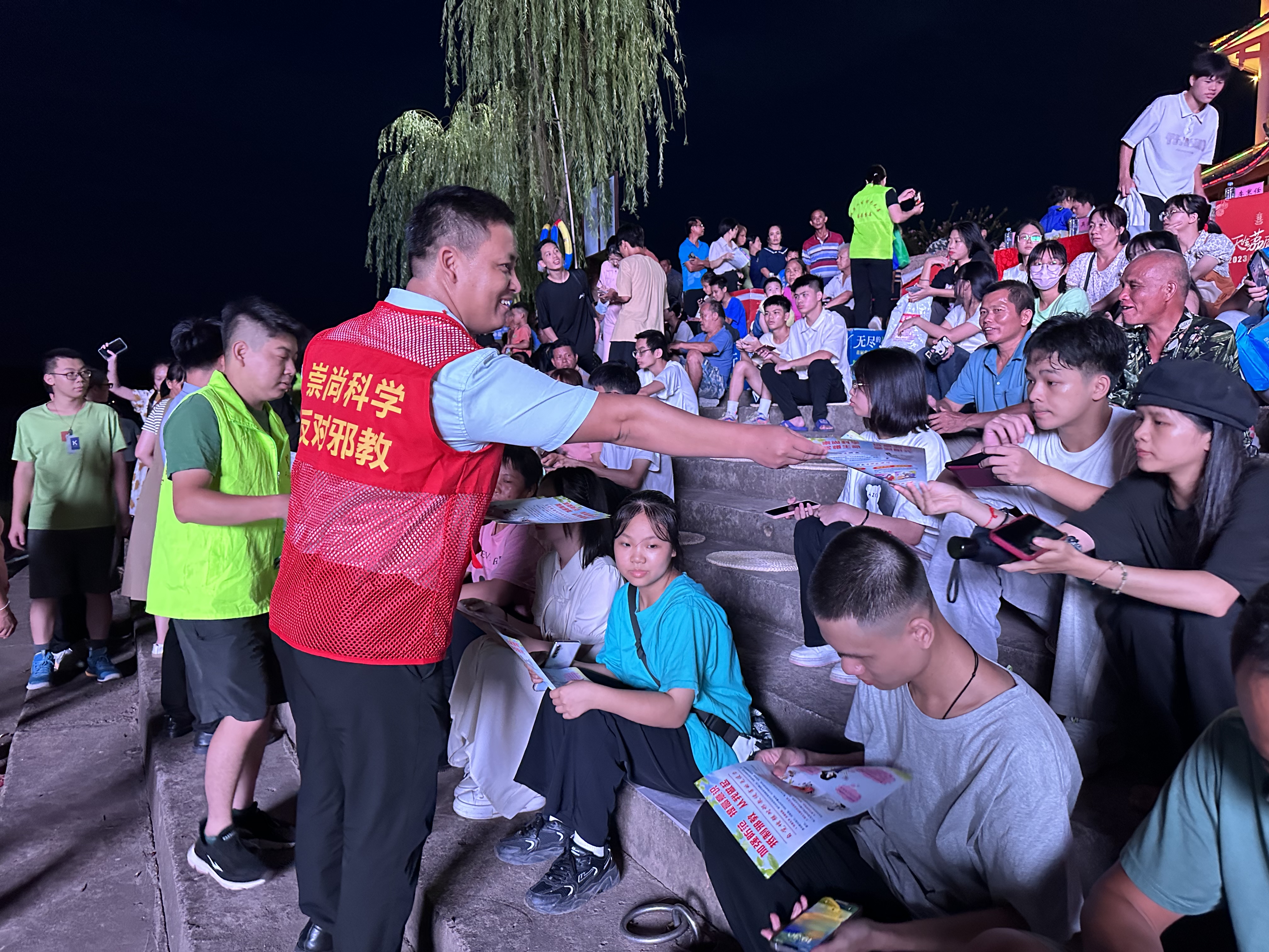 8月28日,濛江镇在“水乡梦·濛江情”特色景区举办2023年奖教助学暨反邪教宣传晚会。精彩纷呈的节目展现了濛江镇的文化魅力,传达了对获奖师生的更上一层楼的美好祝愿,反邪教志愿者在观众席间穿梭,给观看表演的观众们发放反邪教宣传单,在舞台上,表演间隙,主持人开展反邪教知识问答,强化同学们对邪教危害的认识,也希望现场学生们到新的学校能向更多的同学宣传反邪教知识。