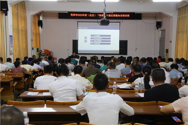 广西反邪教网9月19日凭祥讯(通讯员 凌秋棉)为进一步提升村(社区)“两委”干部识邪、防邪、反邪工作能力,切实增强反邪教工作的责任感、使命感,2023年9月12日,广西凭祥市委政法委以凭祥市2023年村(社区)“两委”干部学习贯彻党的二十大精神专题培训班为契机,对全市249名村(社区)“两委”干部进行反邪教知识培训。