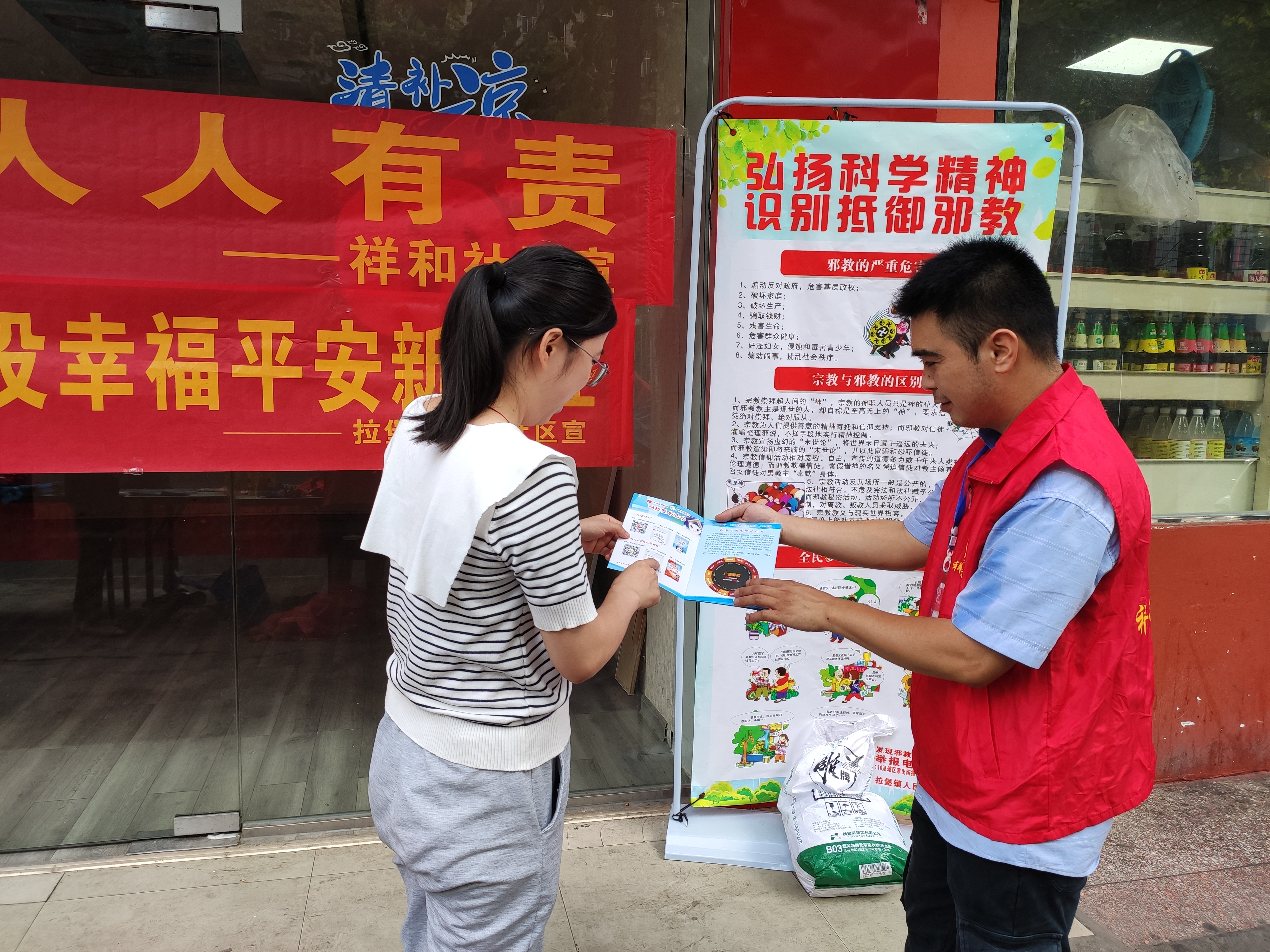 社区网格员与反邪教志愿者通过设立咨询台、摆放展板和悬挂横幅等形式向居民群众开展宣传。通过面对面的沟通交流,向群众讲解什么是邪教、如何识别邪教、如何认清邪教骗人的伎俩等,教育群众在日常生活中擦亮双眼、提高警惕,不被邪教的歪理邪说所诱惑,做到不听、不信、不传、不参与。并鼓励他们发现邪教线索及时举报,构建抵制和反对邪教的良好社会氛围,从根本上铲除邪教滋生的土壤。