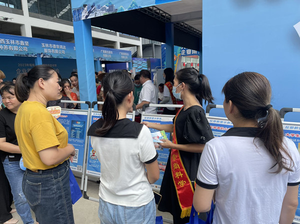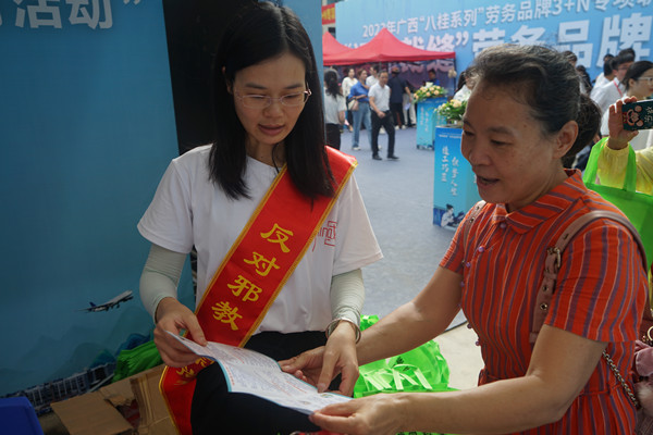 玉林市福绵区因地制宜、巧搭平台,将反邪教工作与劳务品牌专项赛有机融合,形式多样地开展反邪教宣传教育活动。活动前,反邪教志愿服务队向现场的嘉宾、商家、选手等人员送上“反邪教知识大礼包”,并结合宣传手册的知识点与他们进行了深入浅出的解读;活动中,反邪教志愿服务队兵分两队,一队驻守在反邪教宣传驿站,向前来咨询的群众耐心细致地解答日常涉邪教类问题;一队则穿梭在会场的各个角落,向现场群众普及有效防范邪教侵害等有关知识。