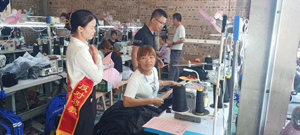 图为珊罗镇走进车间开展反邪教宣传