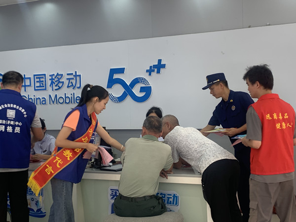 图为江宁镇的网格员工作队伍在营业厅开展反邪教宣传