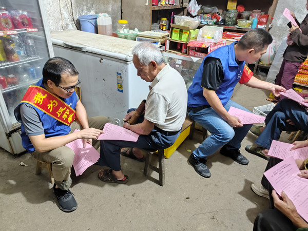 图为浪平镇的网格员工作队伍在乡村小卖铺开展反邪教宣传