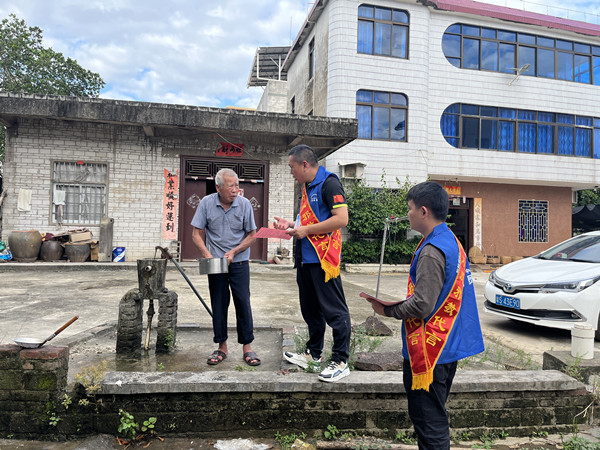 图为博白县松旺镇的网格员工作队伍在群众家门口前开展反邪教宣传