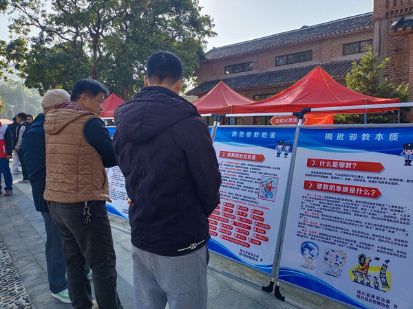 图为在反邪教驿站工作人员向群众开展反邪教宣传