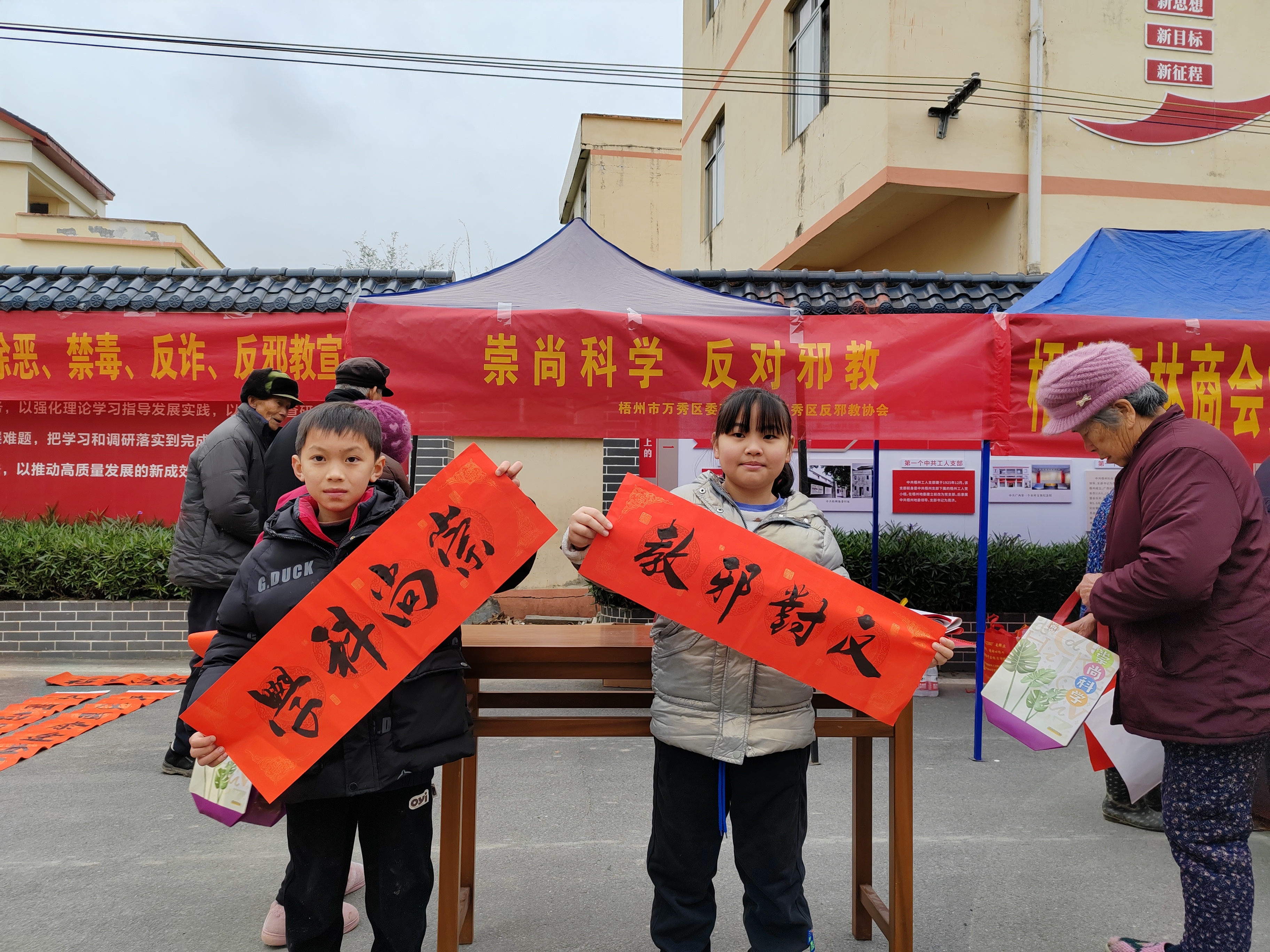 活动现场,反邪教志愿者挥毫泼墨,为到场的村民书写一副副喜气洋洋的春联,送上诚挚的新春祝福。与此同时,万秀区反邪教协会的廖会长向在场群众宣传反邪教知识,向他们讲解什么是邪教、如何防范邪教等知识,教育引导群众牢固树立“崇尚科学,反对邪教”的思想意识,提醒大家在春节这个欢乐的日子里,要保持清醒的头脑,防范和抵制邪教组织的渗透和诱惑。