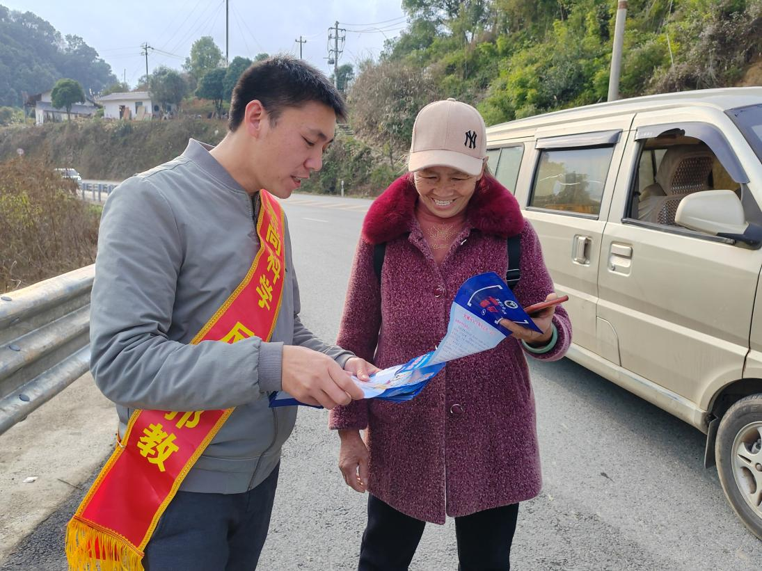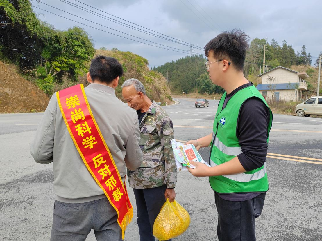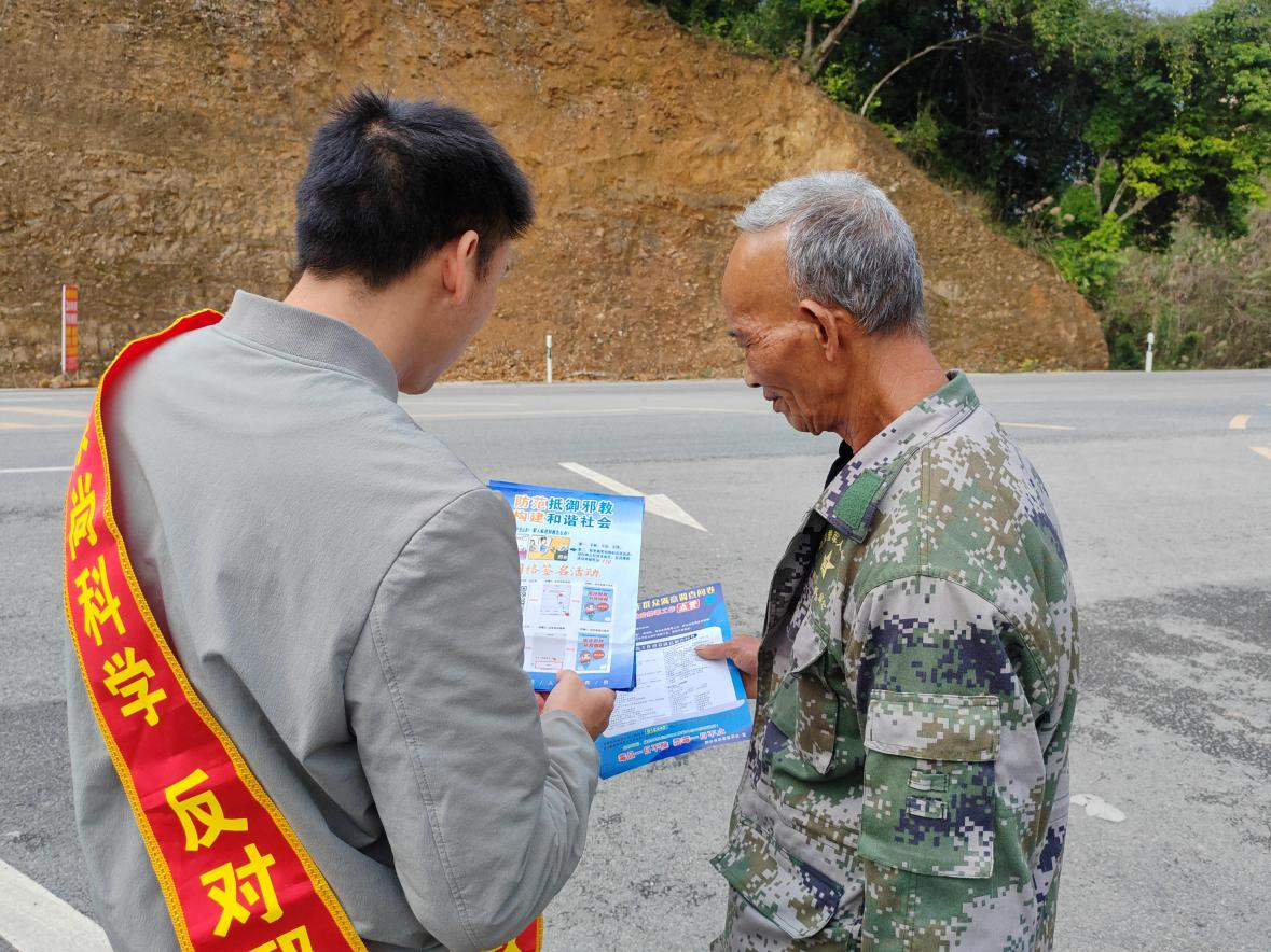 图为宣传人员在融安县大将镇辖区主干道向群众发放宣传资料、讲解反邪教知识