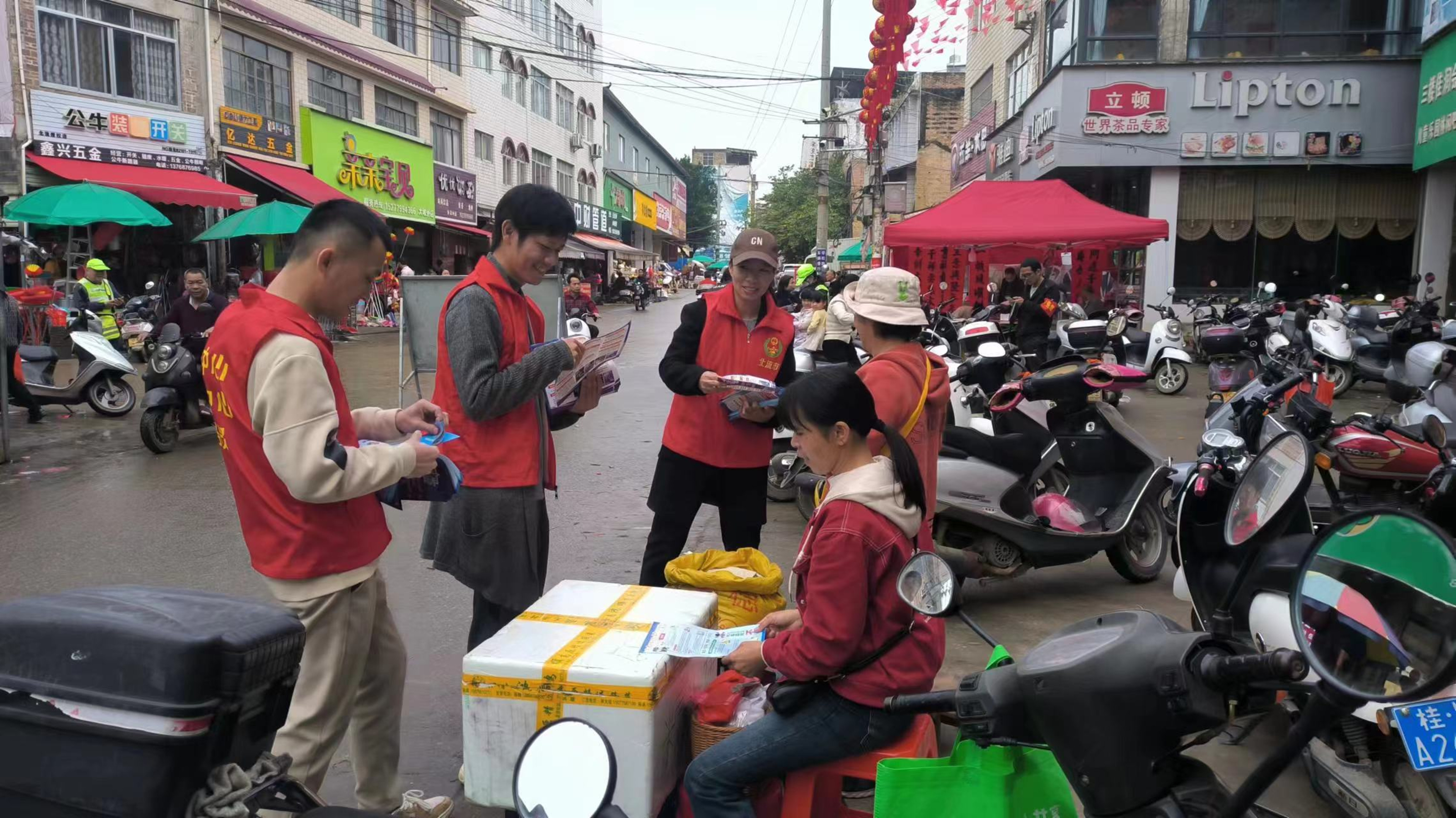 图为网格员向摊主分发反邪教宣传资料