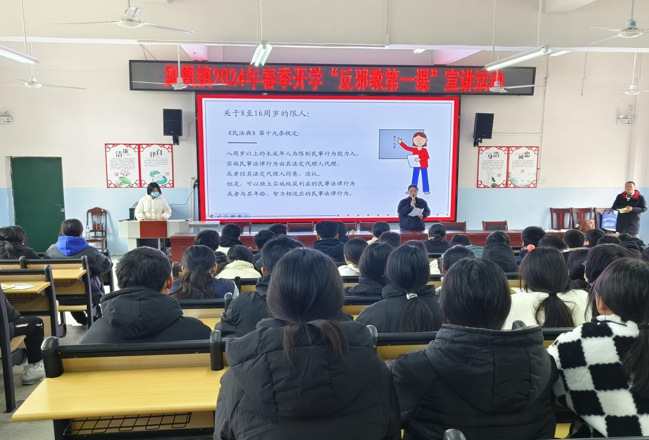 活动现场,司法所所长罗荣通过PPT向学生们普及法律知识,引导他们树立正确的人生观和价值观,保持理性思考,坚守内心信仰。八一派出所民警莫汇龙针对邪教对青少年的渗透特点,结合具体案例详细讲解了邪教的种类、特征及其对社会造成的危害,鼓励学生们发挥志愿者的积极作用,增强社会责任感,共同防范和抵制邪教的侵蚀。。活动还设置了提问环节,通过一问一答的形式,激发了学生的参与热情,活跃了现场气氛。这种寓教于乐的方式,使学生在答题过程中深入了解了反邪教知识,他们纷纷表示将保持警惕,远离邪教。