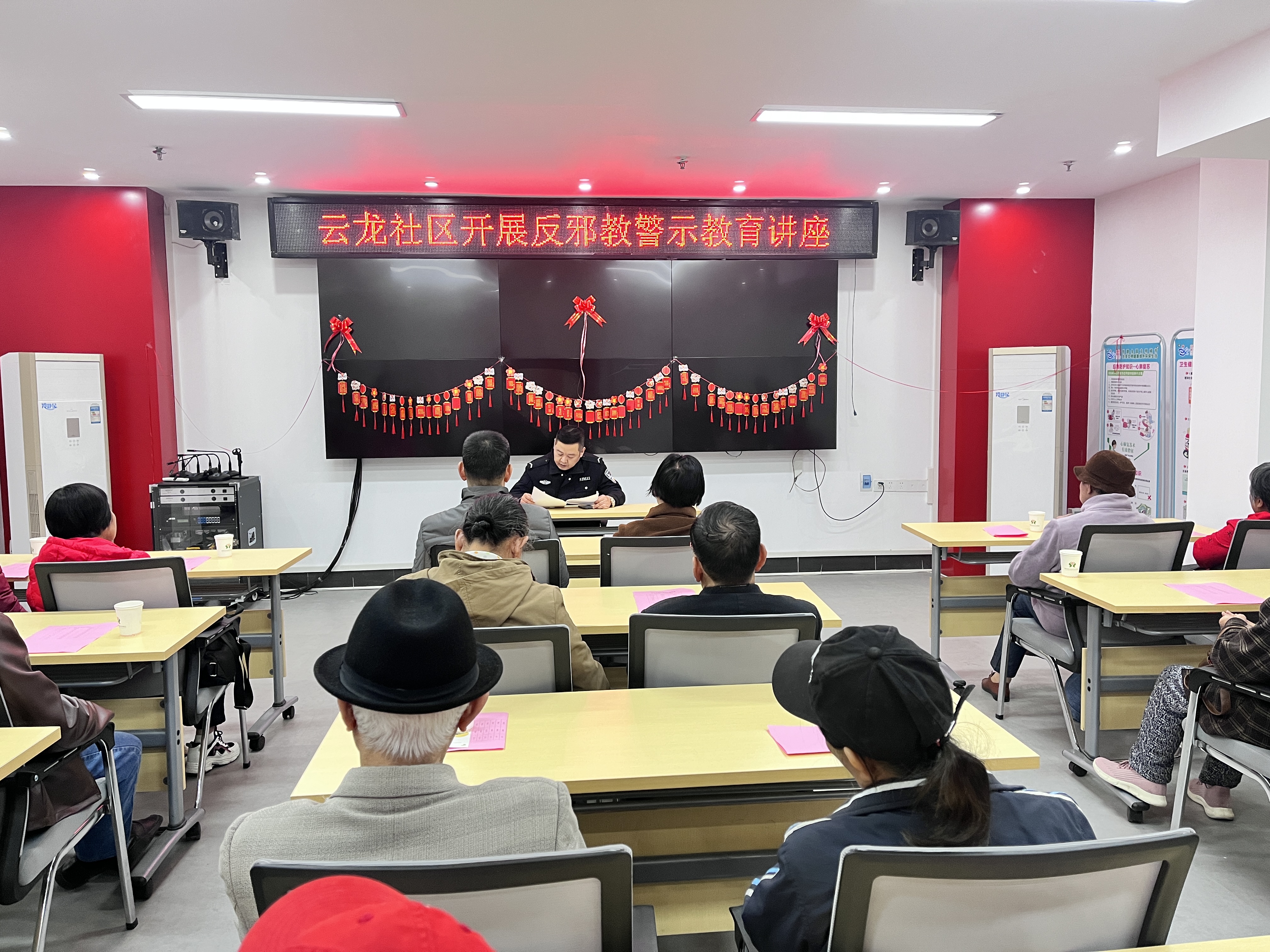 在外来人口多、人流量较大的云龙社区,社区发挥“警格+网格”的合力作用,邀请万秀区石鼓派出所的民警开设反邪教警示教育讲座,重点向居民群众深入介绍邪教组织特征和危害性,提醒居民群众时刻保持警惕。