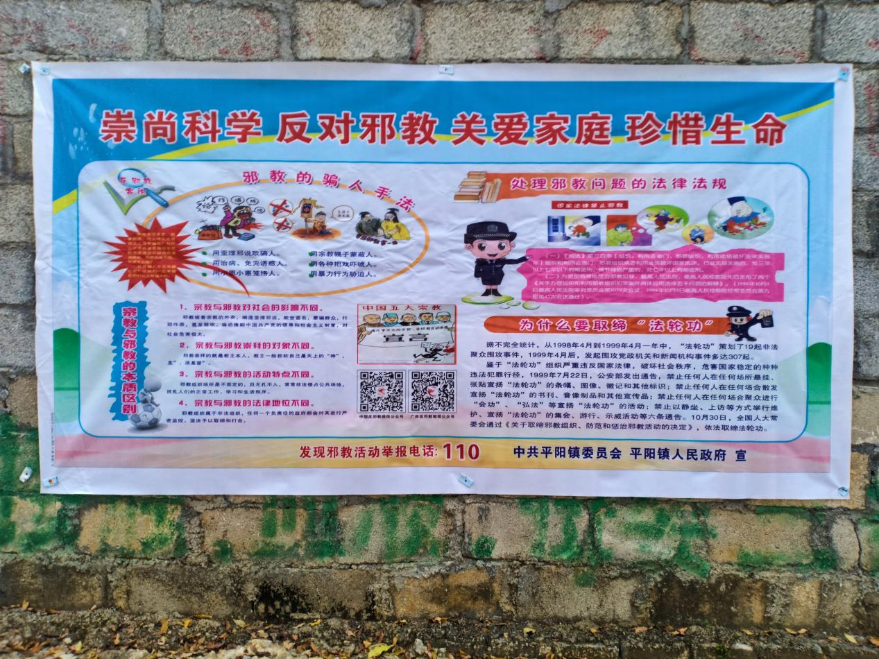 活动中,反邪教志愿者们通过发放反邪教宣传材料、剖析真实案例的方式,向群众揭露了邪教的本质和危害,引导群众面对邪教言论和拉拢蛊惑时做到不听、不看、不信、不传、不参与,鼓励群众积极拨打110报警电话举报邪教违法犯罪活动。此外,平阳镇还在辖区内各个公共场所张贴反邪教宣传海报,揭露邪教的骗人手法及宣传反邪教相关法律法规,进一步推动反邪教警示教育宣传向基层延伸。