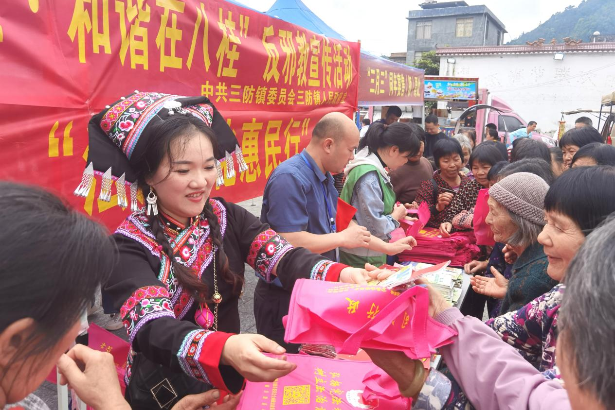 广西反邪教网柳州4月12日讯(通讯员 银巧笛)4月11日,柳州市融水苗族自治县三防镇人民政府以壮族“三月三”活动为契机,镇党委、政府组织各部门工作人员以及镇新时代文明实践所(站)志愿者开展反邪教宣传活动。