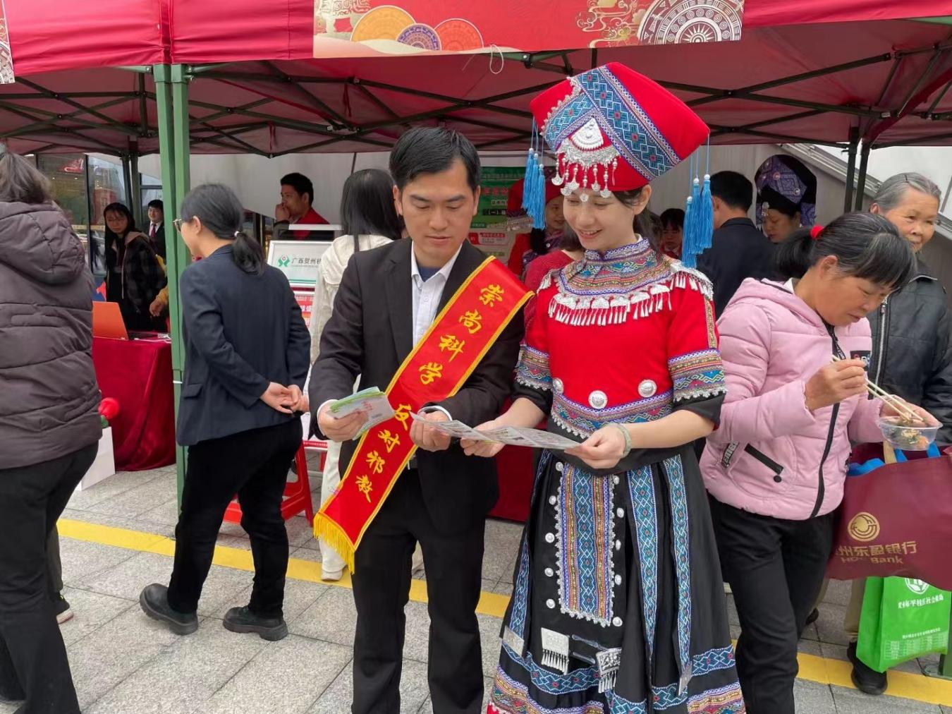 活动现场,青年普法志愿者通过悬挂横幅、发放资料、现场解答等宣传方式,向群众普及反诈骗、反邪教、铸牢中华民族共同体意识、预防青少年违法犯罪、禁毒、国家安全等相关知识,用通俗易懂的语言阐述邪教的本质、特征、种类及危害,提醒群众邪教组织往往披着宗教的外衣,打着骗人的幌子进行非法活动,引导群众在日常生活中要擦亮眼睛,对邪教组织保持警惕,坚决抵制邪教、反对邪教,为实现中华民族伟大复兴中国梦贡献力量。同时,组织平桂区老年大学的学员及瑶族群众现场表演“三句半”和唱山歌,增强群众遵纪守法,安全防范意识,助力群众欢度壮族“三月三”。