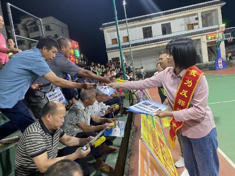场上精彩激烈的球赛赢得观众们的阵阵喝彩和掌声,场下工作人员和大学生志愿者利用比赛休息间隙,向群众发放反邪教宣传资料,现场为群众进行咨询解答,让群众深刻认识到邪教给个人、家庭带来难以挽回的损害,提醒居民在日常生活中要时刻保持警惕,遇到可疑情况及时报警,并引导群众关注广西反邪、中国反邪教微信公众号,参加网上签名活动,共创“无邪”乡村。