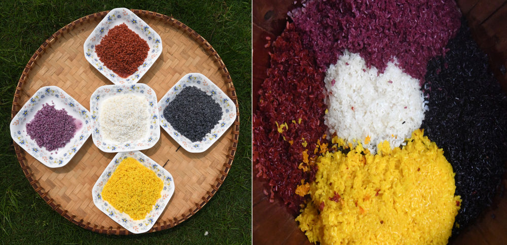 左图:4种不同植物色素染成的糯米和原色糯米;右图:刚刚蒸熟的五色糯米饭(拼版图片)。 新华社记者 陆波岸 摄