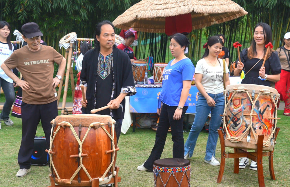 鼓声从青秀山山腰的非遗展示区传来,一旁的游客们跟随打鼓人的节奏参与其中,或摆动鼓槌,或随声舞动。