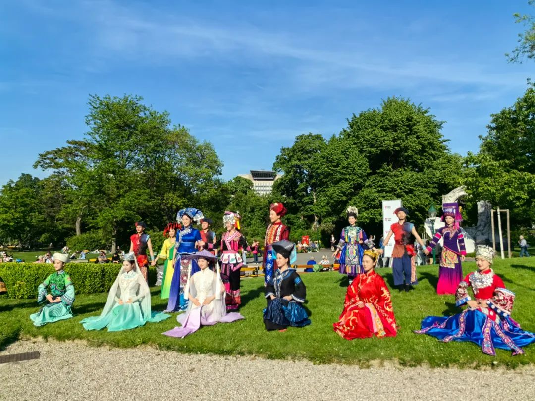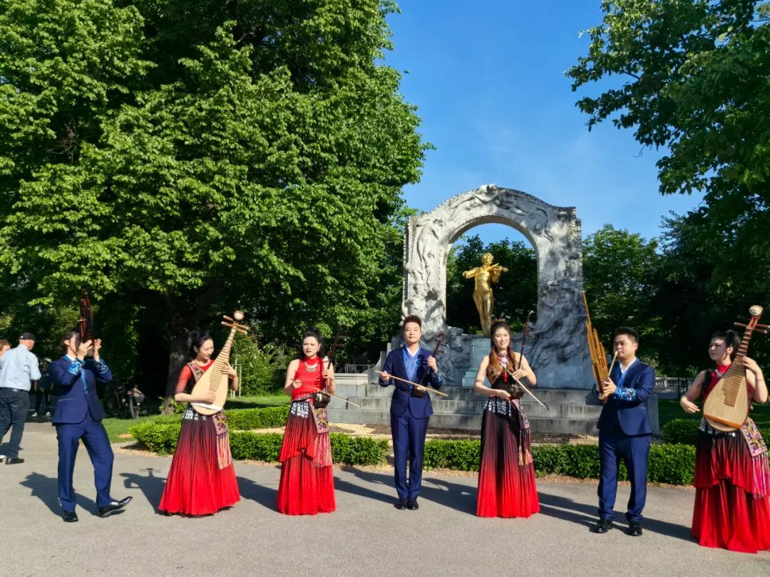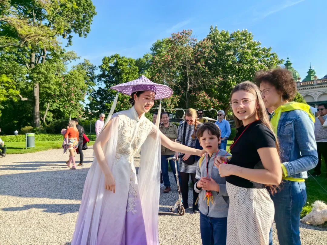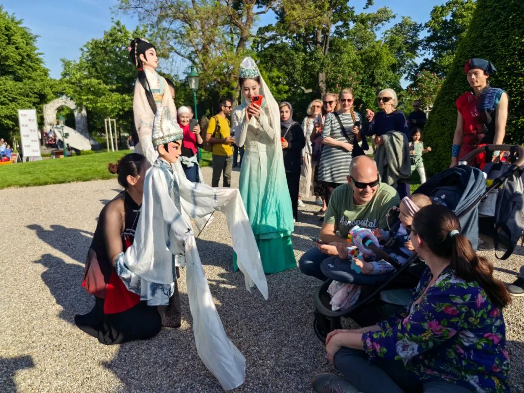 活动开幕前,广西文艺工作者们还身着12个世居民族的节日盛装,走进维也纳街头。在维也纳城市公园和维也纳金色音乐大厅广场等标志性场馆,通过民族服饰走秀、民乐演奏和木偶表演的形式进行“快闪”演出,为维也纳联合国中文日活动进行预热,吸引了大批当地民众和世界各国游客驻足观看,营造了热烈欢快的社会氛围。