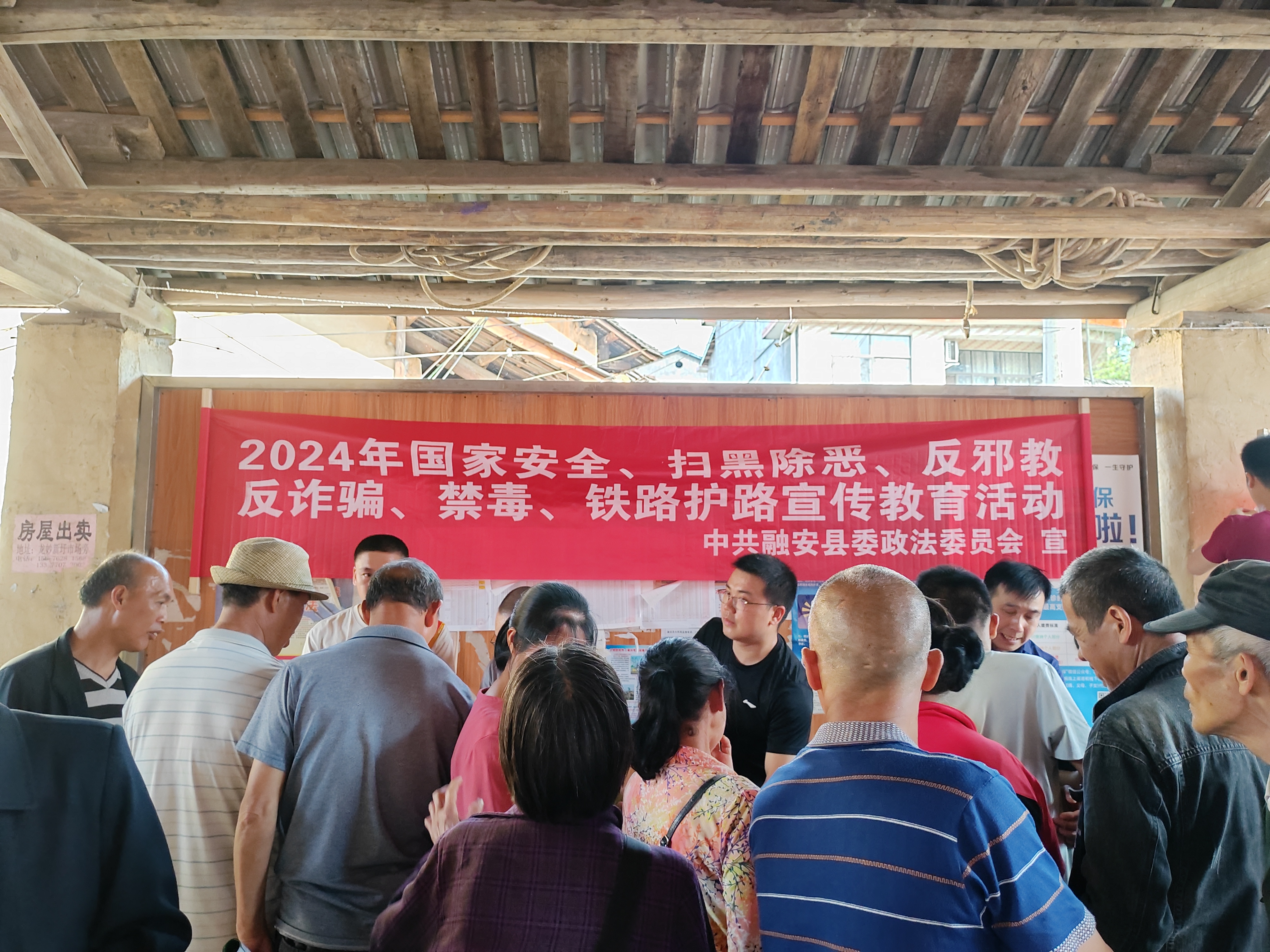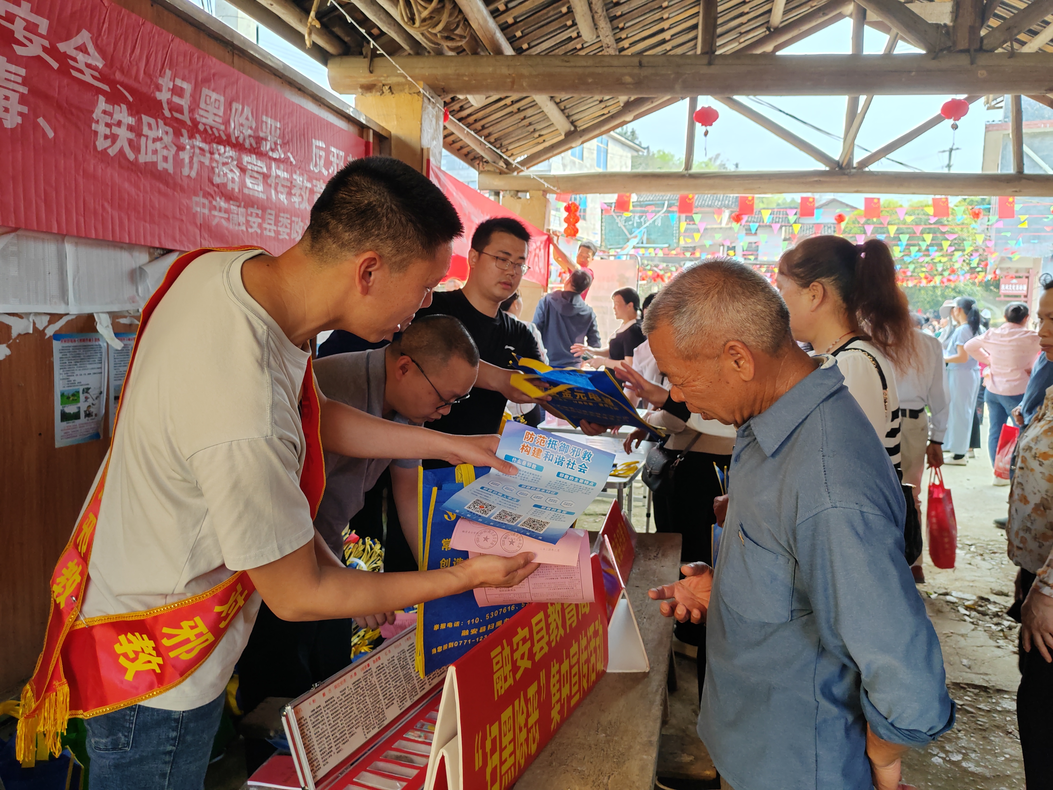 图1:3月25日,融安县大将镇龙妙“二月十六”传统会期开展反邪教宣传活动现场