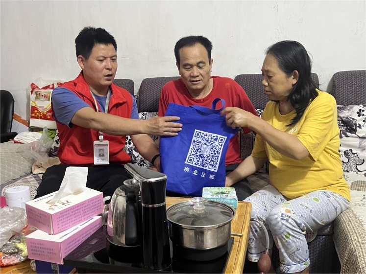 网格员及志愿者深入居民家中,向居民科普反邪教知识,引导居民通过关注官方微信信息平台,参与网上签名拒绝邪教活动。