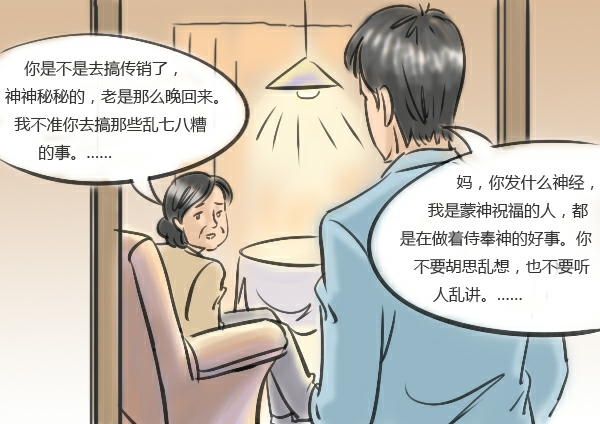 当时我痴迷在“全能神”中,整个人都变了,工作也不像以前那么积极,整天就看“全能神”的书或者去参加聚会。母亲很快就发现了我的异样。一天,母亲拉着我说:“儿子啊,你最近怎么啦?身体不舒服吗?还是生活上遇到什么困难了?”我都是敷衍了事。那时我痴痴地爱着”神“,虽然每天都能见到母亲,却又离她很遥远。现在回想起来,我根本就没有体谅老母亲的苦心,还觉得自己住在家里会影响信奉“全能神”,此后不久我干脆搬了出来。我租的房也顺理成章地变成了教会的接待地点。当时我除了定期给教会上缴“奉献款”,还要负责每次教会活动的接待,解决活动的器材、饮食等等。