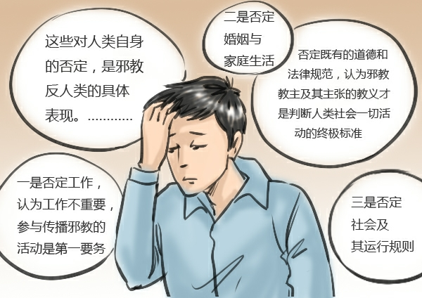 在这个过程中,我深刻体会到邪教否定、反对人类正常的生活方式,包括以下几个方面:一是否定工作,认为工作不重要,参与传播邪教的活动是第一要务。在现实生活中,工作是每个社会成员相互分工合作、促进社会进步的主要方式。邪教对工作的否定,直接断绝了痴迷者及其家庭的生活来源,间接影响整个社会的运转。二是否定婚姻与家庭生活。婚姻与家庭是社会生活的最重要载体,承担着人类生命延续和文明进步的重要任务。但是邪教否定夫妻性生活、否定夫妻之间的义务与责任、否定抚养孩子和孝敬老人的重大意义,其结果是摧毁人类文明的根基。三是否定社会及其运行规则。群体生活特征决定社会对个人和家庭的重要性。但邪教否定友爱同胞、和睦邻居等,否定既有的道德和法律规范,认为邪教教主及其主张的教义才是判断人类社会一切活动的终极标准,只允许信徒在其组织内过教主允许的生活。这些对人类自身的否定,是邪教反人类的具体表现。