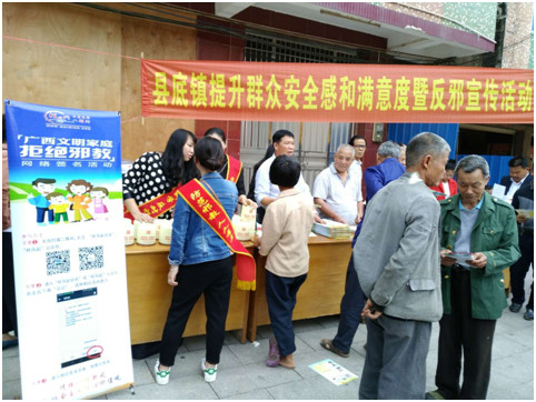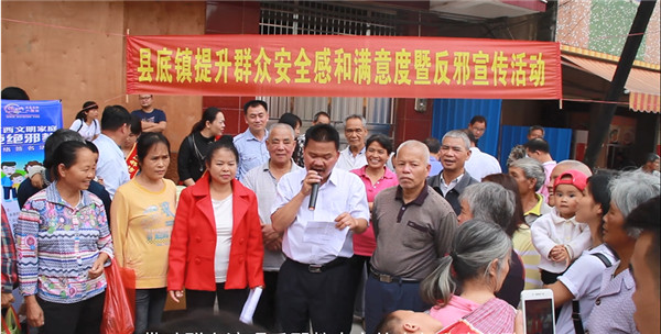 活动邀请了民间知名的石龙诗社社长及主成员,齐唱嘹亮山歌,为宣传造势。群众闻声前来,驻足细聆听。山歌声声内涵多,唱出县底特色的圩日文化,还有识邪防邪反邪警示训。群众们纷纷鼓掌称赞。
