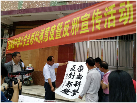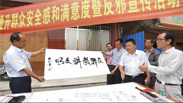 邀请了镇、村书法爱好者现场题字,为宣传写反邪标语。书法家大笔一挥,洋洋洒洒,展现了中华书法的博大精深。群众惊叹书法者行云流水,入木三分的功底,更见书法作品的深道理——倡导反邪教讲文明,尚新风。