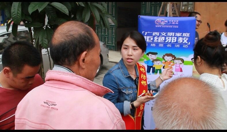 容县防范办工作人员联合石龙诗社成员,书法家们向围观群众分发反邪宣传资料,并引导群众扫码关注“桂风起容县”微信公众号,同时送出反邪大礼包——印有反邪标语的纸巾筒,水杯,购物袋等。